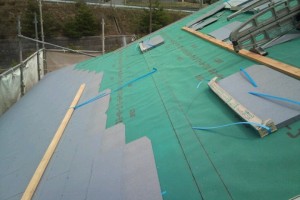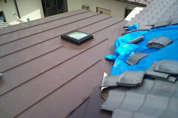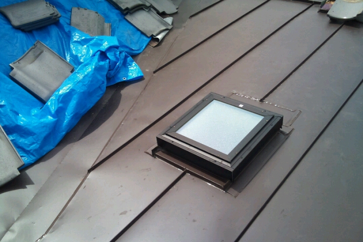 増築部の屋根の勾配が緩い為、今回はガルバリウム鋼板立平葺を施工しました。