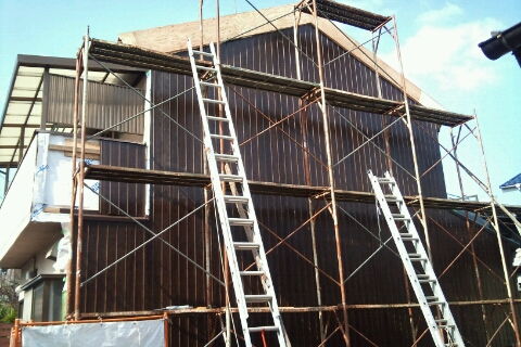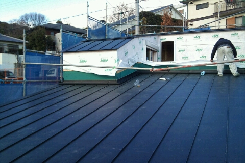 霜を撤去し、長尺の屋根材(ガルバリウム製立平)を荷揚げし、ようやく本体工事です。