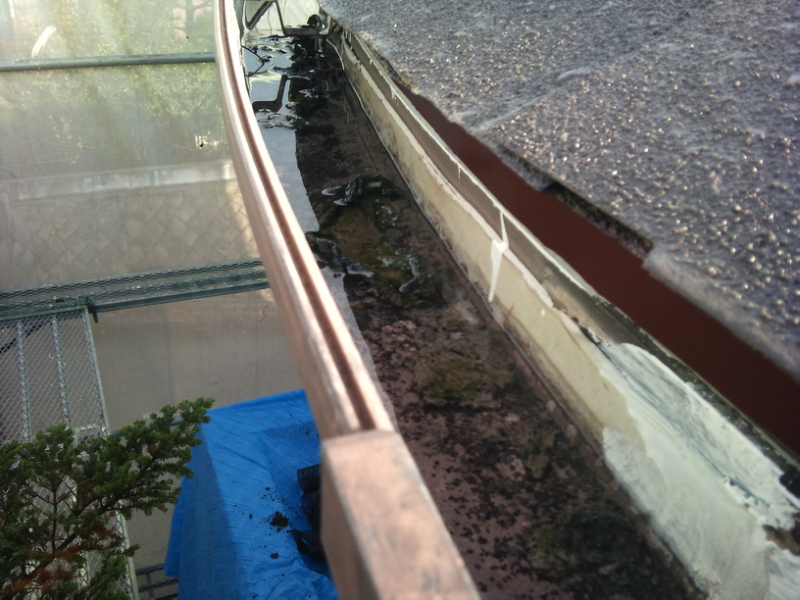 既存雨樋の勾配が悪く、雨樋内にはゴミと雨水がかなり溜まった状態でした。