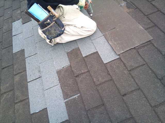 飛散部周辺のアスファルトシングルを調整撤去し、新たにシングル屋根材にて修繕です!