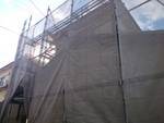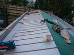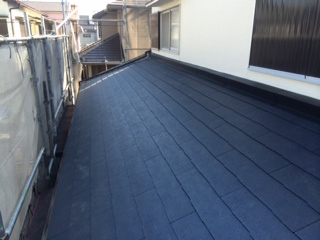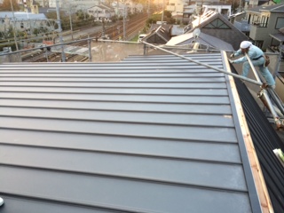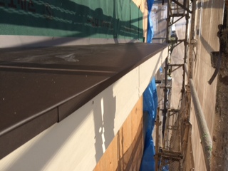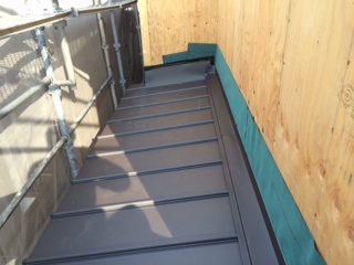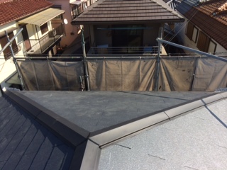 下屋根の葺き替え工事もあり、新設屋根材の施工まで念のため養生シートも施しました。