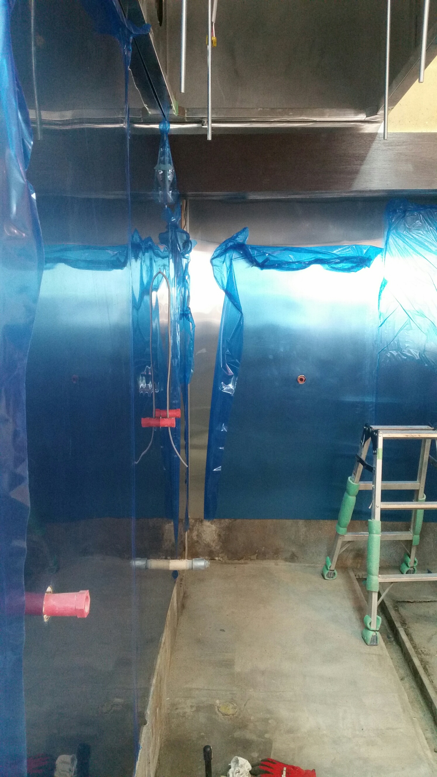 厨房壁面に耐火ボード下地を施し化粧仕上げにてステンレス板ヘアラインにて