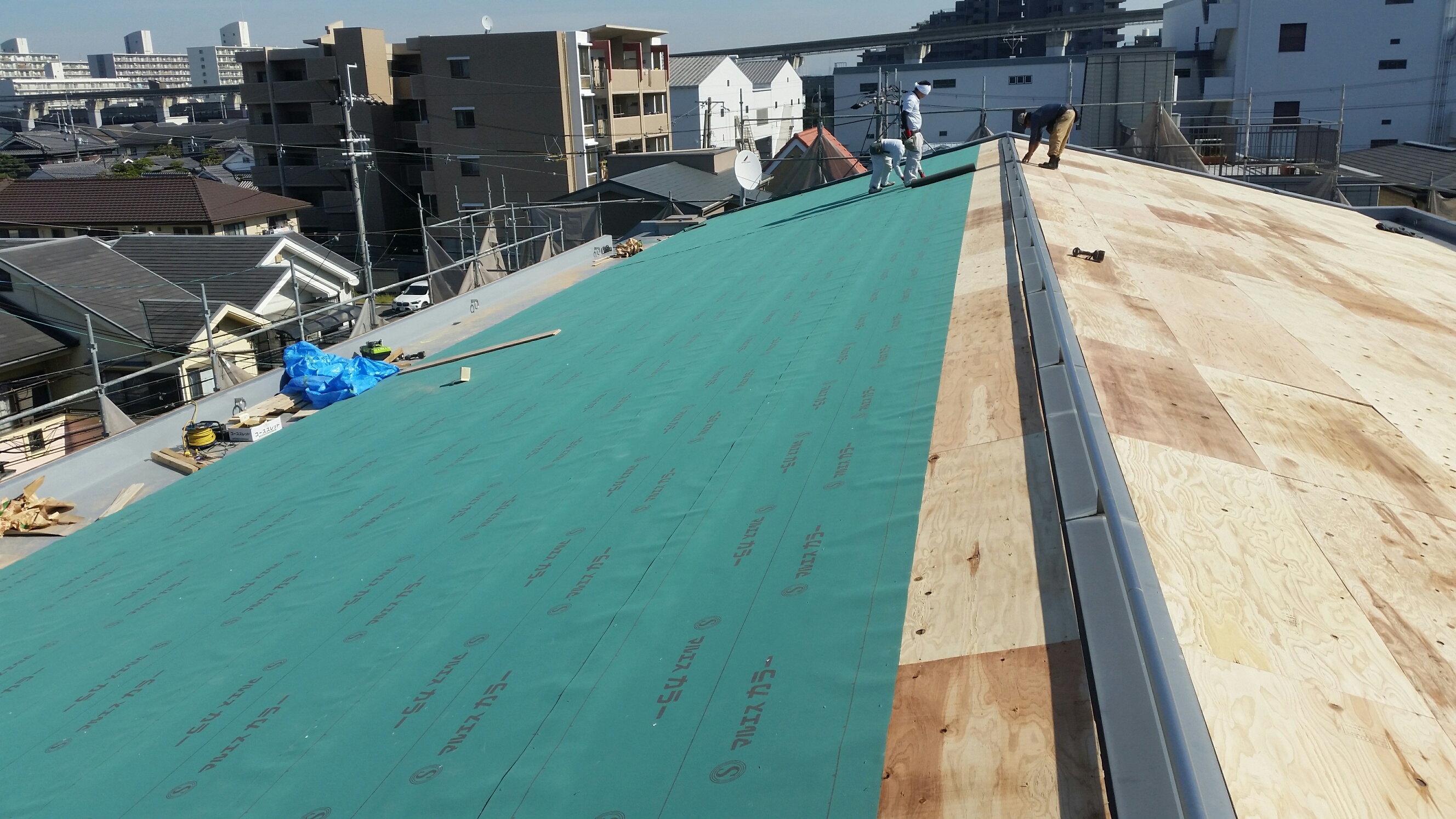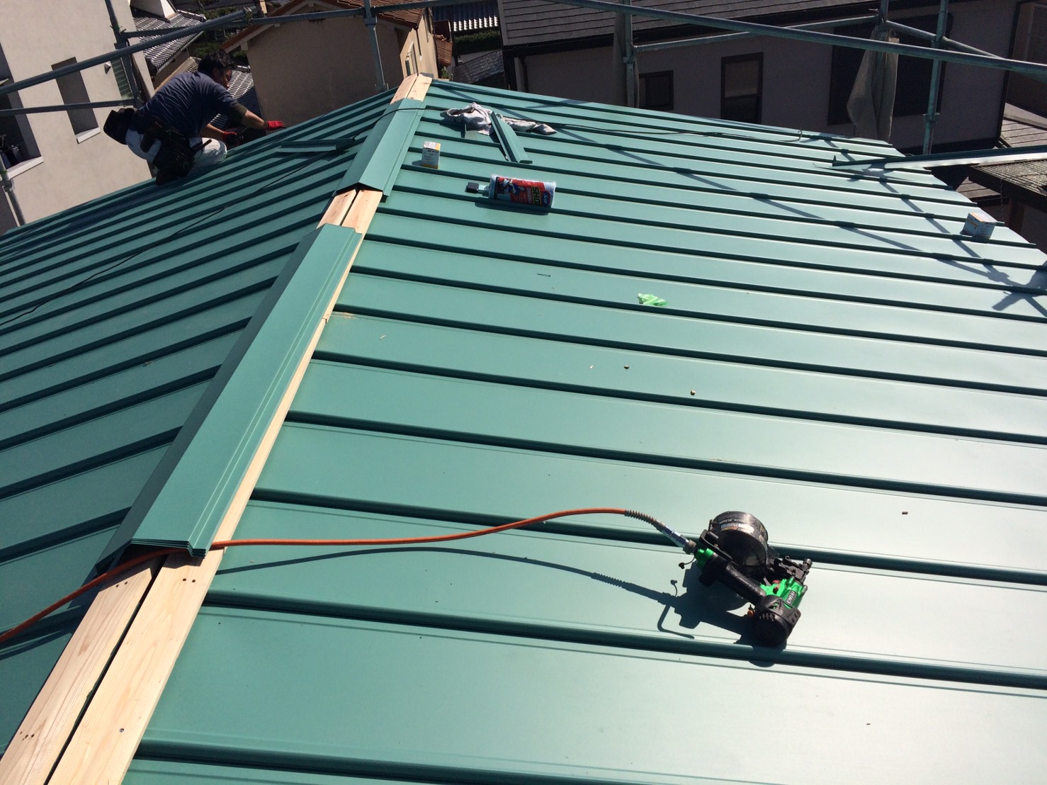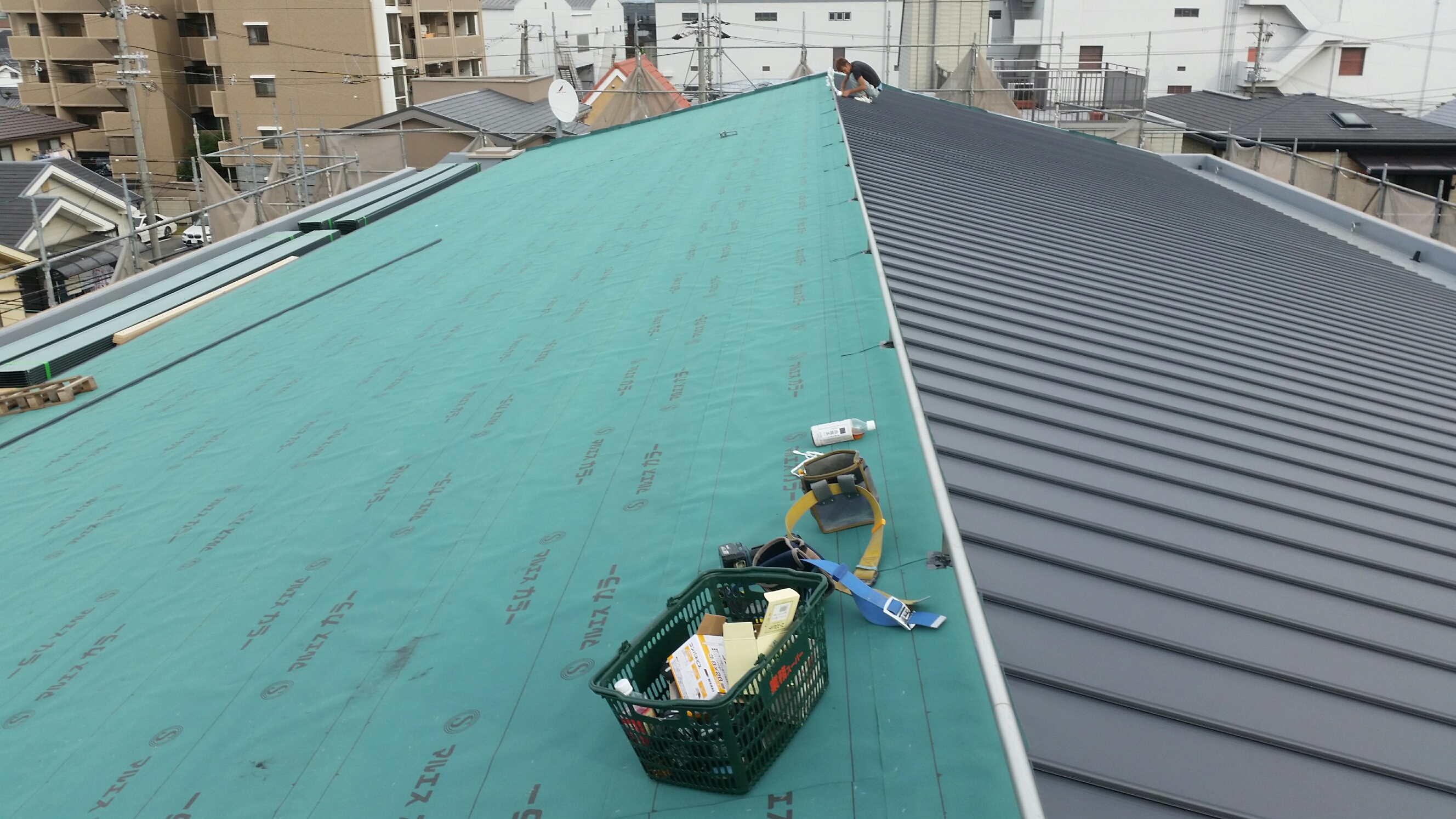 一般住宅の屋根カバー工法です。こちらもガルバリウム鋼板製の立平葺きを