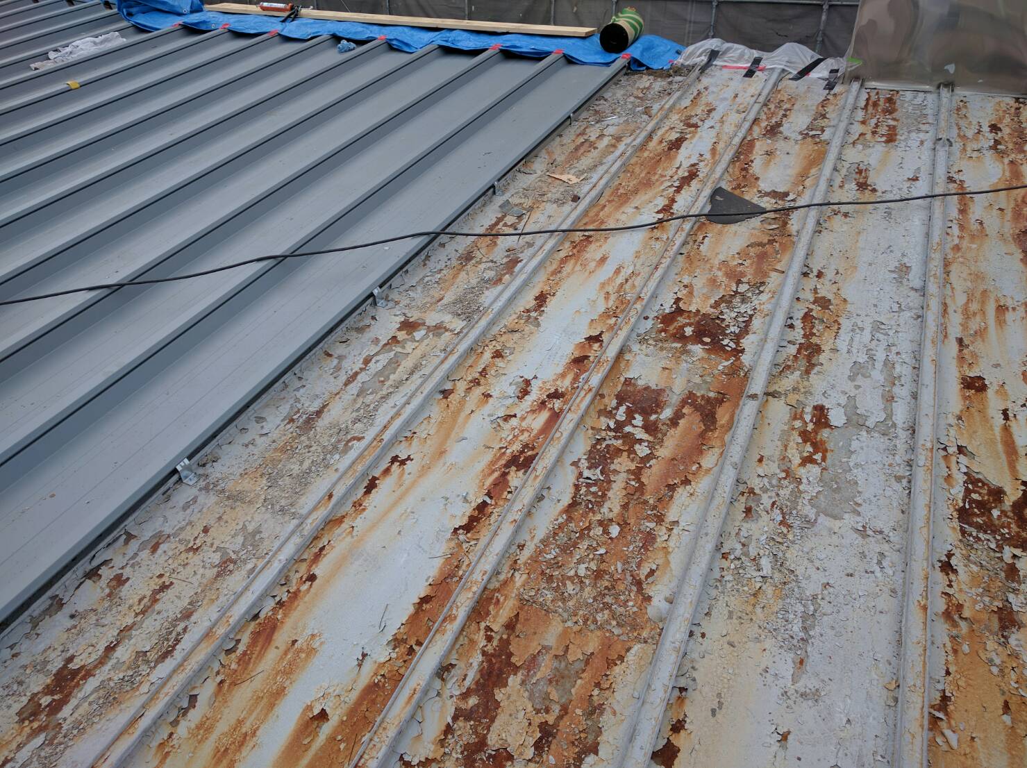 大型店舗の屋根カバー工法です。既存三晃式瓦棒屋根の上に