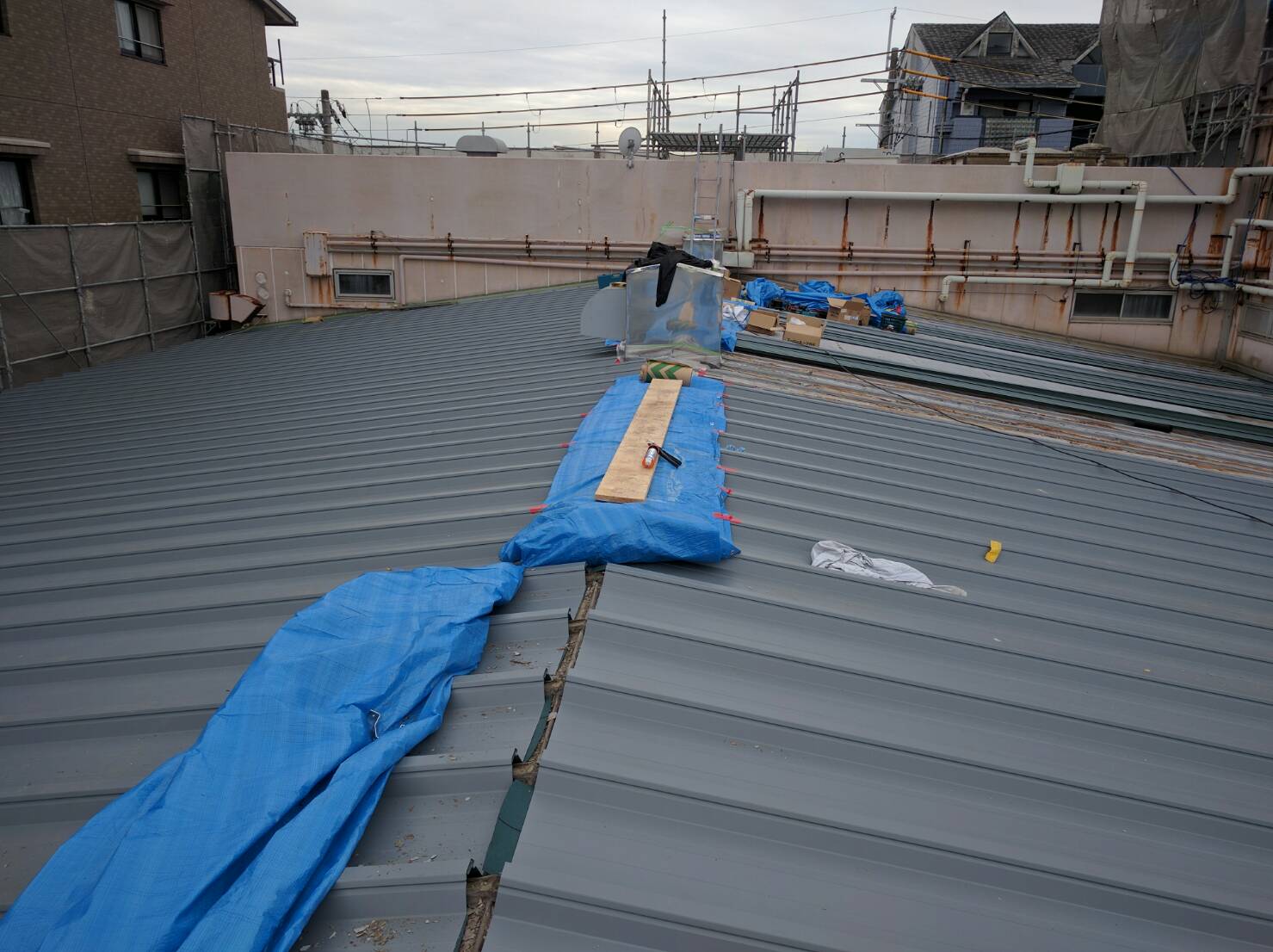 大型マンションの屋根カバー工法です。既存の経年劣化により